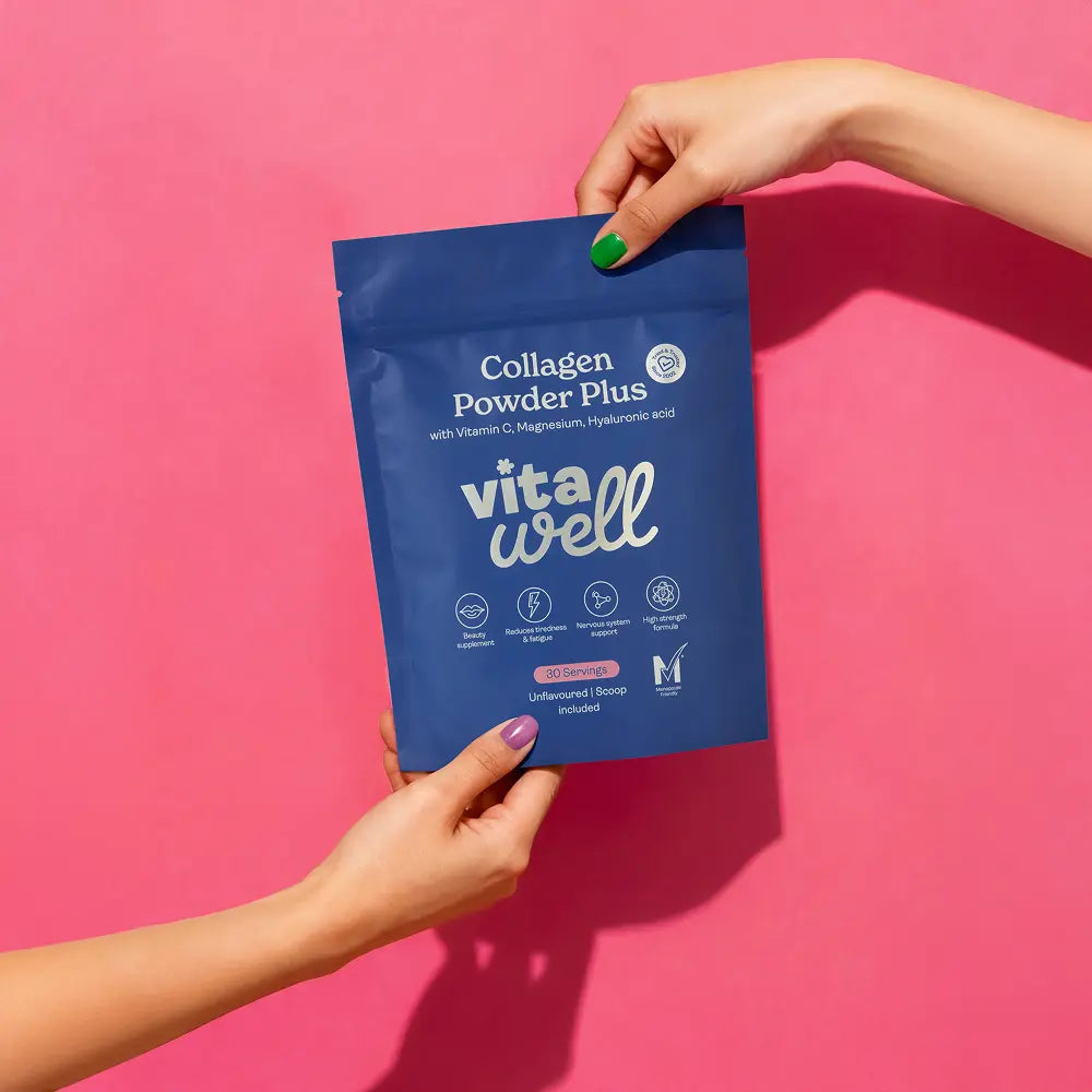Ingredients: Hydrolysed Bovine Collagen Peptides, Magnesium Citrate, Magnesium Oxide, Maltodextrin, Ascorbic Acid, Sodium Hyaluronate. Collagen, the body’s most abundant protein is essential for the structure of skin, bones, tendons, ligaments and cartilage. Made of short peptide chains from amino acids, it is naturally produced in the body. Its productiontends to decline with age, leading to lower collagen levels. With added Vitamin C, which supports normal collagen formation for the normal function of skin, teeth, gums, bones, cartilage, blood vessels and contributes to the protection of cells from oxidative stress. Magnesium helps maintain normal bones and muscles and contributes to normal protein synthesis.